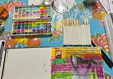 My recent exploratory series is a series of double sided collages mounted and displayed perpendicular to the wall in a 3D way. This body of work is mixed media on paper, where I layout, play, and use a lot of color and multilayered compositions.